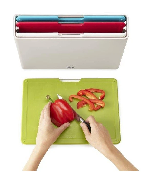 This set includes four colour-coded chopping boards that can be kept beautifully organised in their sleek slimline case.